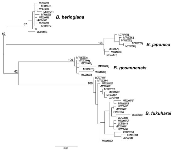 We constructed a phylogenetic tree for the available dataset of the four Beringiana species, B. beringiana, B. japonica, B. fukuharai, and B. gosannensis (Figure 5). The datasets for the latter three species were taken from GenBank; all specimens were from various parts of the Japanese Archipelago. The monophyly of all four species was supported by bootstrap. Species identification of only one specimen was probably incorrect: accession LC519019 was submitted as B. japonica, while it was grouped together with B. beringiana.