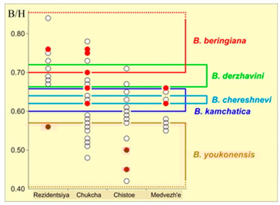 Diagram of the B/H trait in the studied populations. Vertical axis, B/H value; horizontal axis, populations; colored frames indicate B/H values characteristic for the corresponding species. Individuals included in the genetic analysis are shown with red circles.