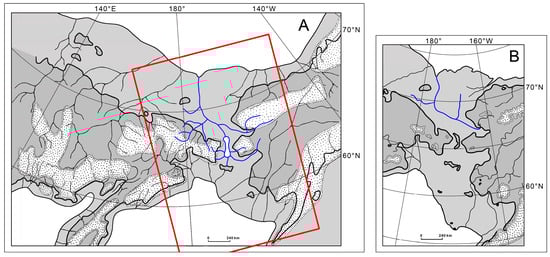 Hydrography of Beringia in the Late Pleistocene ocean regression: (A) after Chereshnev [50] with changes; (B) after Ager [51]. Dark gray, modern land; light gray, land borders 20–18 thousand years BC; white dotted contours, glaciers; white background, open water; rivers draining both continents are shown in blue. The red frame is the position of Figure 7B.