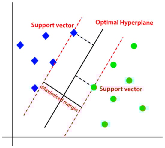 Therefore, the hyperplanes are essential in multidimensional space to distinguish between classes, and they are used to discriminate between two classes ( and ) for two input vectors ( and ). The classification process is an optimization problem, since the margin between the two classes must be maximized. The hyperplane can be expressed as orthogonal weight vector ω as in Equation (7) []: