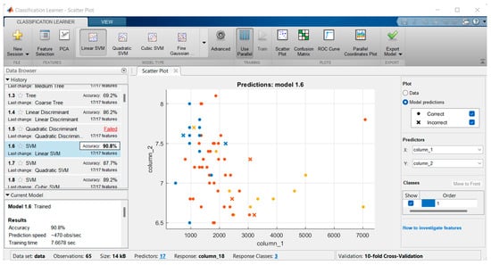 The classification learner is a MATLAB tool. It includes several classifiers, the most important of which are the decision tree, the support vector machine (SVM), the k-nearest neighbors (KNNs), the ensemble trees, and discrimination analysis [,]. In addition, it allows for supervised learning tasks to be performed, such as interactive data exploration, feature selection, defining validation schemes, constructing training models, and evaluating results. Supervised machine learning can be performed using different classifiers by feeding a known dataset (observations) and a known output (responses) in the form of labels of classes. The trained model can be exported to predict the classes of a new dataset.