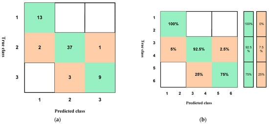 Figure 4a,b show the confusion matrix of the training data in their raw form. It illustrates the number of accurate predictions in green cells and the number of inaccurate predictions in red cells. For class 1 (excellent WQI), the trained linear SVM produced accurate predictions for all samples, the same as the actual WQI states, and it accurately predicted the 13 samples with excellent WQI states (13/13, 100%). A total of 37 out of 40 samples were inaccurately predicted as having good WQI, with a prediction accuracy of 92.5%. The prediction accuracy of the poor WQI samples was 75%, with 9 out of 12 samples being accurately predicted.