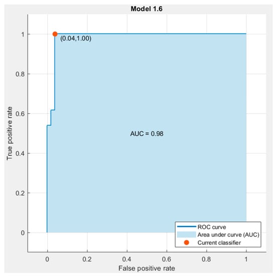 Figure 6 illustrates the receiver operating characteristics (ROC). It depicts the current classifier performance with the true positive rate (TPR) and false positive rate (FPR). In total, 4% of the observations were inaccurately assigned to the positive category based on FPR, and 100% were accurately classified as TPR. Therefore, a classifier’s accuracy can be measured according to its area under the curve (AUC), which refers to a prediction accuracy of 98%. Hence, the classifier performed better than expected.