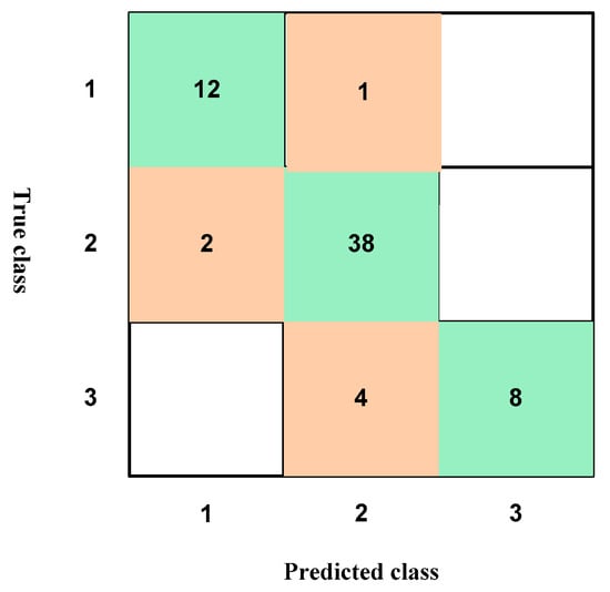The positive and negative predictive values can be determined as shown in Figure 5. The predicted class 3, for poor WQI, appeared ten times: nine were accurate, with an accuracy of 90%, and one sample was predicted as having a good WQI (class 2), with a 10% error rate. The excellent WQI state appeared 15 times, 13 times accurately, with 87% positive predictive value, and twice as an inaccurate prediction or false prediction, with an error rate of 13%. The two false samples were classified as having a good WQI.
