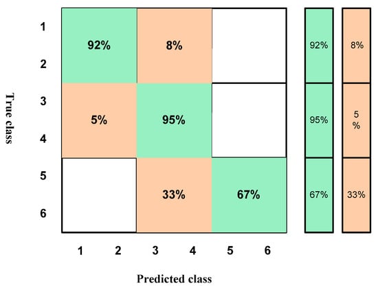 The effect of data normalization was investigated, to determine whether it enhances the prediction accuracy or leads to a decrease. Thus, data normalization was performed as in (1). The new data were trained for all classifiers using the classification learner tool in MATLAB, and the same result was obtained. The linear SVM produced the highest prediction accuracy, with a value of 89.2%, as shown in Figure 7. The confusion matrix of the prediction results of the trained model referred to some changes rather than the trained model results with raw data. The number of accurate predictions in each class was changed. The results of the trained model indicated that 12 out of 13 excellent WQI samples were accurate, with a prediction accuracy of 92%. For the good WQI samples, 38 were accurately predicted with a prediction accuracy of 95%, and 2 were inaccurate predictions, with a 5% prediction accuracy. Finally, the prediction accuracy of the poor WQI state was 67%, where 8 out of 12 samples were predicted accurately. Figure 8 illustrates the prediction accuracy for each class, where the green cells refer to the accurate predictions, while the red cells refer to the incorrect predictions.