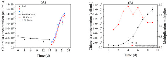Culture of Chlorella sp. in BG-11 culture medium. (A) The changes in cell concentrations under the seal and open conditions. (B) The Chlorella sp. culture curve and the changes in the proliferation multiples at the 1.01 × 106 cell/mL initial concentration. (C) The Chlorella sp. culture curve and the changes in the proliferation multiples at the 2.82 × 106 cell/mL initial concentration.