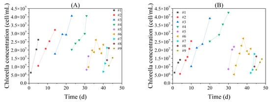 The changes in Chlorella sp. concentrations in different dosage combinations of Chlorella sp. and natural microorganisms in wastewater are shown in Figure 10A. In all different combinations, the concentrations of Chlorella sp. decreased significantly. Finally, the maximum concentration was only 6.55 × 106 cell/mL, which is 40.94% of the standard concentration in BG-11 and 16.62% of the maximum concentration in wastewater. This suggested that natural microorganisms can effectively control Chlorella sp. concentrations. Natural microorganisms can be applied to remove Chlorella sp. cells in wastewater.