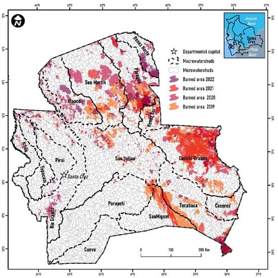 The watershed prioritization uses two different scales of analysis: micro- and macrowatersheds. The prioritization area was narrowed down to a spatial selection of the watersheds in which fires occurred between 2019 and 2022. The watershed level 12 dataset from the HydroSHEDS product was used for the microwatersheds (Table 1). The macrowatersheds layer was generated by the GADSC with the watershed name attributes corresponding to the main Santa Cruz rivers []. The watershed layers were processed in ArcMap to identify the watersheds impacted by fires using the Fundación para la Conservación del Bosque Chiquitano’s (FCBC) fire scar maps from the years 2019 to 2022 (Table 1). This selection was used to create a mask for the spatial aggregation. The total burned area and area burned in each macrowatershed was calculated with ArcMap raster calculations and zonal statistic tools.
