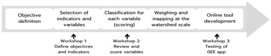 All the MCA steps were implemented using GEE. The GEE platform offers interactive and user-friendly interfaces designed for conducting spatial analyses using either Earth Engine’s data catalog or uploaded datasets []. First, the spatial layers representing the ranked variables were imported into the GEE database. Then, a Javascript code was developed in the code editor to read-in the spatial data and perform the aggregation, weighting, and mapping of the prioritized watersheds. For the purpose of accessibility and the potential for local hosting, the code was used to create an online application (https://jeannefdz.users.earthengine.app/view/watershed-prioritizer-sc, updated on 7 August 2023). The tool was presented to local stakeholders during the testing workshop, and this provided an opportunity for potential users to review the prioritization framework and discuss future developments.