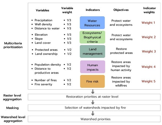 The main technique applied in the prioritization methodology is a conventional compensatory MCA that entails defining objectives and selecting, ranking, and weighting the variables that support the objectives in order to evaluate different prioritization alternatives. For spatial problems, this process involves the translation of geographic data into priority assessments and preferences using GIS [].