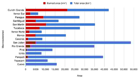 Burned areas in the watersheds of the department of Santa Cruz and their relation to the total watershed area (km2).