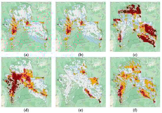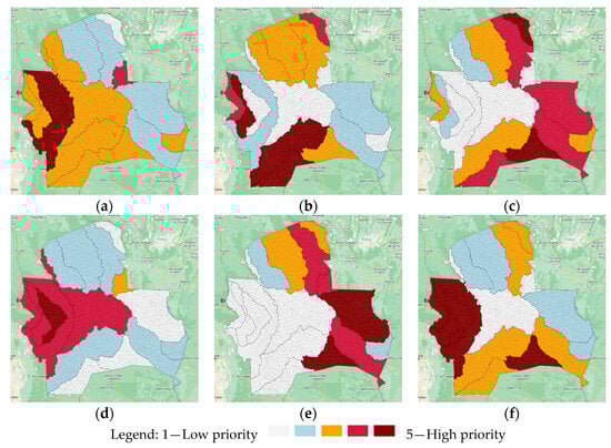 Macrowatershed level priority maps for scenarios A-F. (a) Scenario A—water; (b) Scenario B—ecosystems; (c) Scenario C—management; (d) Scenario D—human activities; (e) Scenario E—natural hazards; (f) Scenario F—all combined.