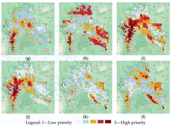 Microwatershed level priority maps for scenarios A-L. (a) Scenario A—water; (b) Scenario B—ecosystems; (c) Scenario C—management; (d) Scenario D—human activities; (e) Scenario E—natural hazards; (f) Scenario F—all combined; (g) Scenario G—water + ecosystems; (h) Scenario H—water + ecosystems + management; (i) Scenario I—human impacts + fire; (j) Scenario J—water + human impacts; (k) Scenario K—water + fire; (l) Scenario L—ecosystems + fire.