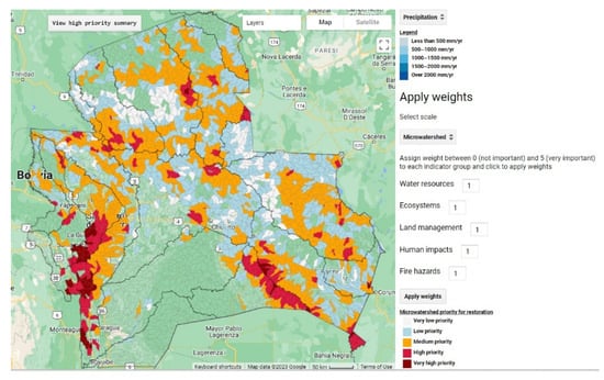 The online GEE application incorporates the key indicators and objectives applied to the watershed prioritization in Santa Cruz. The application includes the set of spatial datasets that were collaboratively selected and that can be combined at the watershed level. As shown in Figure 7, the interface consists of a Google Maps layer, which is centered on the department of Santa Cruz. The user can select spatial datasets to be displayed by clicking on layer names located in the drop-down list, e.g., “Precipitation”. The map and legend are updated according to the chosen indicator.