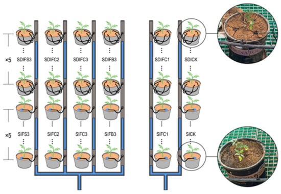The experimental trial was conducted utilizing the ‘Jing Fan 404’ tomato cultivar and spanned from 27 September 2022 to 10 January 2023. The experiment was carried out using polyvinyl chloride (PVC) pots with dimensions of a 32 cm outer diameter, a 29.5 cm inner diameter, a 26 cm bottom diameter, and 33.5 cm in height. Each pot was filled with 18.31 kg of soil, with a total of 60 pots used in the test.