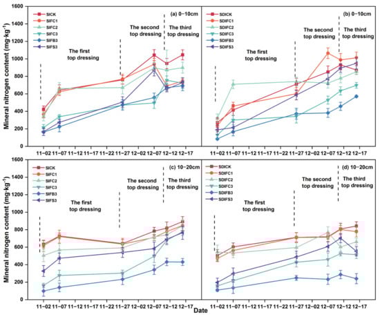In terms of the soil layers, the mineral nitrogen concentration within the 10–20 cm stratum generally trailed behind that of the 0–10 cm layer. Among the treatments, the SICK treatment exhibited the highest content, measuring 892.68 mg/kg. The magnitude of variation in the 10–20 cm soil layer was relatively small throughout the reproductive period, with SIFC3 showing the greatest variation in mineral N content at 67.99%, and SDIFC2 showing the least at 21.46%.