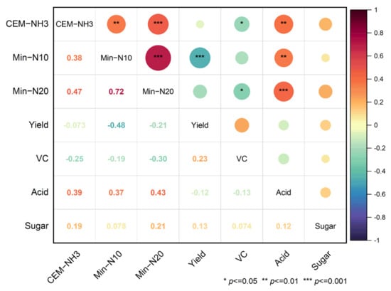 Correlation thermogram. Note: I means irrigation technology; F means fertilizer treatment; CEM-NH3 means cumulative emission of NH3; Min-N10 and Min-N20 mean residual mineral nitrogen of the 0–10 cm and 10–20 cm soil layers, respectively, and VC means vitamin C.