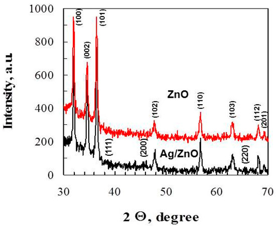 Different diffraction peaks at 2θ = 31.94°, 34.67°, 36.51°, 48.23°, 56.84°, 63.22°, 67.53° and 68.18° are depicted in the diffraction pattern (Figure 2) of pure ZnO and Ag 10−2/ZnO powder films. These peaks correspond to the lattice plane orientations of each peak with hkl of (100), (002), (101), (102), (110), (103), (112) and (201), which are indexed to zinc oxide hexagonal wurtzite structure []. The peak positions are in good agreement with JCPDS card no. 96-230-0117. The powder films’ diffraction peaks demonstrate a crystalline structure that is free of impurities or phase modifications. The strong and sharp peaks in the XRD patterns of both pure ZnO and Ag 10−2/ZnO samples indicate a high degree of crystallinity []. In addition, the diffraction pattern of Ag/ZnO (co-catalytically modified zinc oxide at the highest Ag+ concentration of 10−2M) shows additional small peaks. The crystal planes of metallic Ag with JCPDS card no. 96-901-3048 can be found at 2θ = 38.46°, 45.86° and 64.72°, with diffraction peaks (111), (200) and (220) at 2θ = 38.46°, 45.86° and 64.72°. The XRD patterns of pure ZnO and Ag 10−2/ZnO-modified films have no noticeable differences due to the low concentration of silver ions.