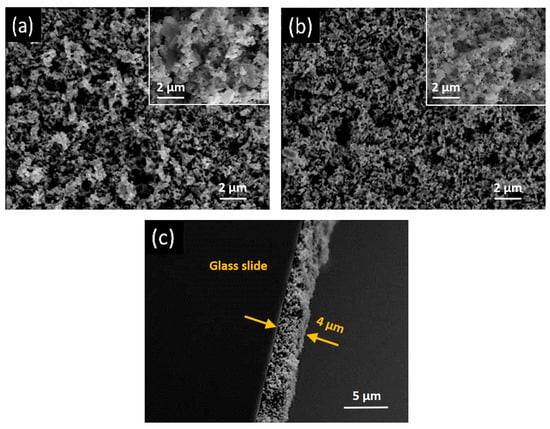 Surface morphology of (a) pure and (b) silver (10−2 M) co-catalytically modified ZnO nanostructures. Cross-section of the ZnO film (c). The inserts of (a,b) show higher-magnification images.