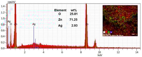 Energy-dispersive X-ray spectroscopy is utilized to estimate the presence of Zn, O and Ag chemical elements (Figure 4) in the co-catalytically modified ZnO film with the greatest (10–2 M) silver content.