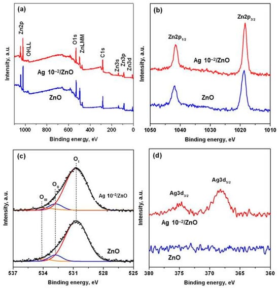(a) XPS survey spectra, (b) Zn2p, (c) O 1s and (d) Ag 3d core-level spectra of the ZnO and Ag 10−2/ZnO films.