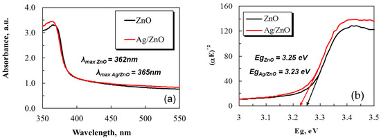 UV–vis absorbance spectroscopy is used to calculate the band gap energy (Eg) of pure and co-catalytically modified ZnO films (Figure 6a). The spectra show the presence of a band edge in the ultraviolet region (λmaxAg 10−2/ZnO = 365 nm and λmaxZnO = 362), which is consistent with zinc oxide’s properties []. This is explained by the zinc oxide being photoexcited from the lower valence band to the higher conduction band. Additionally, the reaction between the noble metal and semiconductor is assumed to be responsible for the shifting of absorbance peaks to higher wavelengths [,]. Using data from UV–vis spectroscopy, the band gap energy (Eg) is computed (Figure 6b).