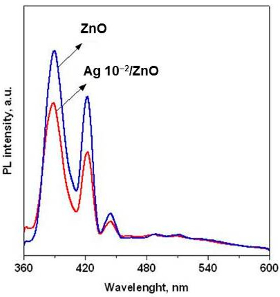 Room temperature PL spectra of ZnO and Ag 10−2/ZnO powder films.