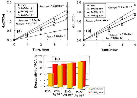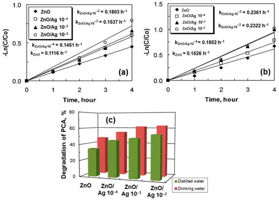 Initially, we investigate the photocatalytic properties only of zinc oxide modified with silver ions at a concentration of 10−2 M. The experimental results show that the silver-modified sample has higher activity compared to the pure semiconductor. Furthermore, the photocatalytic characteristics of two additional films (Ag 10−3/ZnO and Ag 10−4/ZnO) are also studied. Adsorption tests conducted in complete darkness show that 5% of the analgesic is adsorbed before being exposed to light radiation. The pseudo-first-order kinetics of contaminant removal is confirmed by the logarithmic plots of paracetamol concentration versus irradiation time, and the rate constants (k) are shown in Figure 8a,b. It is found that the mean time, during the co-catalyst fixation process, and the photocatalytic properties for Ag-modified films rise proportionally with the Ag+ ions concentration. This is supported by the fact that the rate constant, k, increases as the concentration of silver ions increases from 10−4 to 10−2 M in both cases (paracetamol in drinking water and distilled water). Since UV light can excite electrons in the catalyst and oxidize the organic pollutant, higher values of the rate constants indicate faster PCA degradation. This finding may also be explained by a decrease in the rate of recombination of the formed charge pairs (e−/h+) and a narrowing of the band gap width in the samples with Ag.