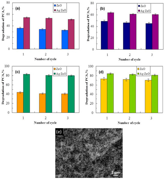 Photostability of pure and Ag 10−2 M/ZnO photocatalysts on the removal of paracetamol using UV ((a) distilled and (b) drinking water) and natural sunlight ((c) distilled and (d) drinking water). (e) SEM image of the Ag 10−2 M/ZnO film after 3 cyclical experiments.