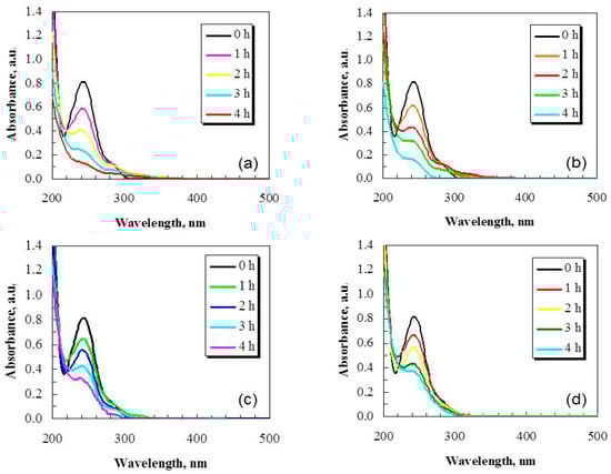 Finally, Figure 11 displays UV–vis spectra of paracetamol degradation in the presence of an Ag 10−2/ZnO photocatalyst, as obtained under natural sunlight and UV light in drinking and distilled water. As previously reported [], the spectrum of paracetamol shows bands at 194 and 243 nm due to the π → π* and to the n → π* electronic transitions of the aromatic ring and the C=O group, respectively []. As can be seen, these bands gradually decline with irradiation time, indicating the efficient photocatalytic reactions. According to the literature, photocatalytic degradation of paracetamol leads to the formation of non-toxic carboxylic acids as final products of the process. Since no additional bands appear in the spectra after the photocatalytic reactions, one may conclude that the presence of toxic by-products in the final solutions can be ruled out.