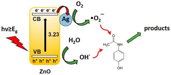 When UV or sunlight is absorbed by ZnO, electrons in the valence band (VB) are excited to move into the conduction band (CB). The rate of photocatalysis is decreased by the recombination of e−/h+ charge carriers. The ability of Ag to trap electrons may help to explain the beneficial effect of co-catalytic modification with silver ions on ZnO efficiency for paracetamol photodegradation. The freshly formed Fermi level of Ag/ZnO is lower than the energy of the bottom of the CB (Fermi level of Ag 0.99 eV vs. NHE) [], and the transfer of photogenerated e− from the CB into Ag is possible. The drug could be broken down by the highly reactive species (superoxide anion) produced when oxygen molecules interact with the electrons in Ag. According to Ramasamy et al. [], the electron transfer to the silver ion cannot be effectively competed with by oxygen-scavenging electrons at the surface of excited semiconductor particles. As a result, the formation of O2•− is decreased because the electron transfer to the silver ion is quicker than the electron transfer to the oxygen molecule. However, the loading of Ag metals on the ZnO surface in the silver co-catalytically modified semiconductor can hasten the transport of photogenerated electrons to the outer systems. Deposits of metal become partially negatively charged as a result of electron transfer. By accelerating the transfer of electrons to dissolved oxygen molecules, the deposits of silver ions on the surface increase photoactivity. As a result, oxygen reduction leads to the formation of the superoxide anion radical through the transfer of trapped electrons from Ag metal to oxygen. Furthermore, the holes in VB of ZnO interact with water molecules to create hydroxyl radicals, which also break down the organic molecules. A schematic of the proposed photocatalytic mechanism of Ag–ZnO film is presented in Scheme 1.