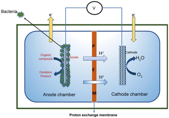 The microorganisms on the anode surface create direct or mediated electron transfer channels to aid in this electron transfer process. The anode chamber becomes more acidic due to the simultaneous release of protons (H+) created during the oxidation of organic materials into the solution. These protons move towards the cathode chamber through the electrolyte. A membrane or ion exchange separator separates the anode and cathode chambers, which also permits proton migration. As a result, the anode and cathode solutions cannot be mixed directly. A second electrode serves as the electron acceptor in the cathode chamber, typically for oxygen reduction. Water is created when oxygen from the cathode and protons and electrons from the anode chamber come together. Electrons produced at the anode travel via an external circuit to produce an electric current that can be used to power electronics or recharge batteries, among other valuable applications. A continuous flow of electrons from the anode to the cathode is made possible by the external circuit’s flow of electrons, which completes the electrochemical circuit. The microbial metabolism and the voltage differential between the anode and cathode electrodes propel this electron flow. Figure 1 shows schematic diagram of the main components of the MFC. The microbial oxidation of organic materials at the anode, which produces electrons and protons, is the main component of the microbial fuel cell mechanism [31]. It is important to note that different MFCs may use different microbial species, substrate compositions, electrode materials, and system configurations, which might affect performance and efficiency. Microbial fuel cells’ processes and operating parameters are now being further understood and optimized for better performance and broader applications.