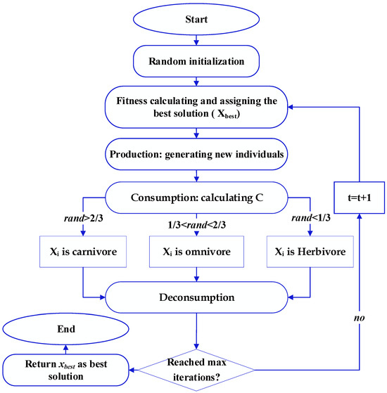 The AEO flowchart is presented in Figure 2. As explained in Figure 2, in the consumption stage, the consumer feeds on another consumer with a lower energy level or on a producer. For the consumer classes, carnivores, herbivores, and omnivores.