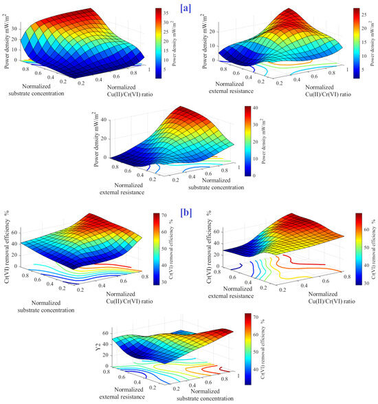 Three-dimensional plot of controlling parameters: [a] power density and [b] Cr(VI) removal efficiency.