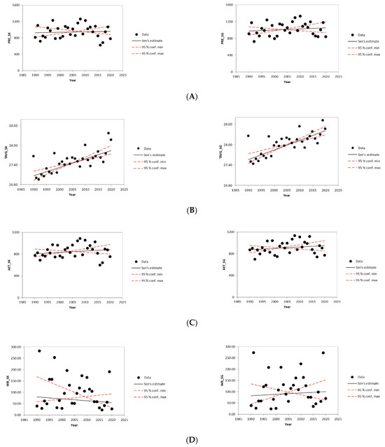 | Catchment | Mann–Kendall Statistic (S) | Tau (τ) | Sen’s Slope Estimator (Q) | Zs | p-value (Two-Tailed Test) |