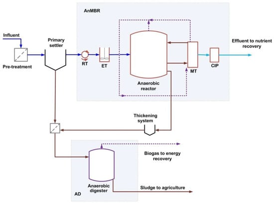 Anaerobic membrane bioreactors (AnMBRs) offer a promising solution to addressing the challenges of applying anaerobic processes to low-loaded wastewaters, including municipal wastewater (MWW). This innovative technology combines an anaerobic reactor and a membrane filtration system to completely retain the slow-growth microorganisms and its advantages are increasingly attracting the attention of the scientific community [,].