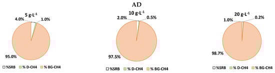 Sludge digestibility is related to the degree of sludge stabilization. The very low value of anaerobic digestibility (9.8 ± 1.2%) obtained for the first period (SRT = 70 d, HRT = 25 h, T = 25 °C) indicates that almost all the biodegradable organic matter was degraded by SRB. In fact, this value is similar to that obtained by [] at SRT = 140 d, T = 27 °C and HRT = 24.4 h. This result demonstrates that an SRT = 70 days and HRT of 25 h provide sufficient time to remove all biodegradable organic matter, rendering further biological treatment unnecessary. As the HRT and temperature decreased, the amount of organic matter degraded by SRB also decreased and raised anaerobic digestibility to 25% at HRT = 12 h and 34% at HRT = 8.5 h. This can be explained by the non-degraded soluble organic compounds, since the percentage of MLVSs is the same in both periods. Feeding this sludge to the anaerobic digester thus would boost methane production.