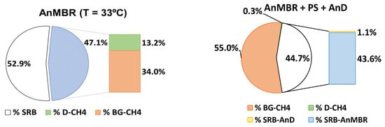 Finally, the percentage of the influent biodegradable COD ending up as methane in the biogas in the (PS + AnMBR + AD) accounted for 55%, i.e., 61.8% higher than the treatment in an AnMBR alone under the most favorable operational conditions (i.e., 33 °C).