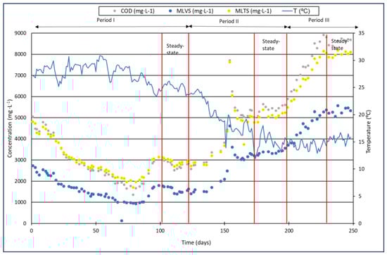 Changes in MLTS, MLVS, temperature and COD concentrations in the AnMBR during the three periods.