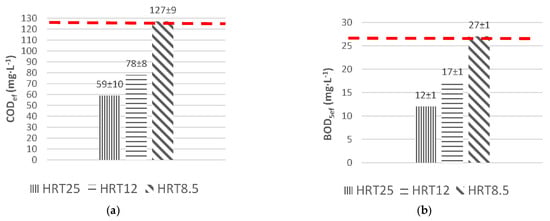 Average effluent composition for (a) CODef and (b) BDO5ef. The dash red line indicates the European discharge quality standards (European Wastewater Directive, CE 91/271).
