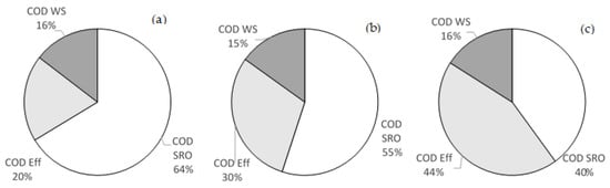 Figure 6 shows the COD mass balance for the three periods evaluated. As can be seen, the percentage of waste sludge COD is similar during the entire experimental period because the SRT was maintained constant at 70 days. The main differences between the periods were the percentages of influent COD present in the permeate and degraded by SRB, which were significantly affected by HRT and temperature. In fact, 44% of the influent COD was present in the permeate and the effluent COD and BOD concentrations were above the European discharge limits (see Figure 5).