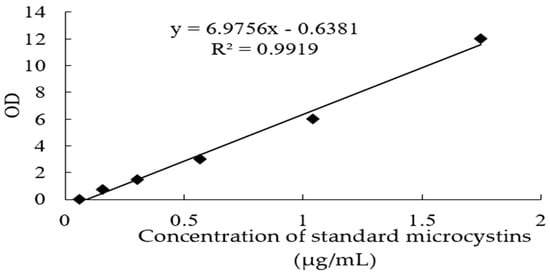 Find out the corresponding concentration from the standard curve according to the OD value of the sample and then multiply it by the dilution factor to get the actual concentration of algae toxin in the sample. The experimental data were processed in SPSS 22 software, expressed as mean ± S.D., and analyzed using one-way ANOVA, and the sample means were analyzed using LSD multiple comparisons; p < 0.05 is a significant difference, and p < 0.01 is an extremely significant difference.