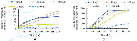 Effects of different concentrations exposure on the population density of M. aeruginosa: (a) EF; (b) CF.