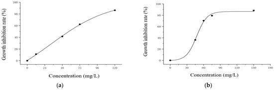 The 96 h inhibition rate curves of EF and CF against M. aeruginosa are shown in Figure 4. The curve equation and determination coefficient are shown in Table 3. R2 is greater than 0.9, indicating that the curve fit is good.