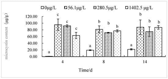 On the 14th day, the MCs content of the CK group was 22.766 μg/g, but the MCs value of 56.1 μg/L EF group, 280.5 μg/L EF group, and 1402.5 μg/L EF group were 86. 265 μg/g, 75.062 μg/g and 87. 418 μg/g, respectively; these three treatment groups were 3.789, 3.296 and 3.840 times of CK group on the 14th day, respectively. So, the MCs content of these three treatment groups was extremely significantly higher than that of CK group on the 14th day (p < 0.01).