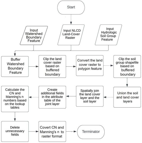In this paper, we introduce a unique ArcMap Python-based tool that simplifies and automates the computational process of key parameters in hydrologic analysis and hydraulic modeling, i.e., the SCS-CN and Manning’s n roughness coefficients, using the geospatial land cover data. Conceived in response to the growing need for geospatial input data for grid-based simulations in hydrology and hydraulic disciplines, the current tool efficiently fills the gap in the existing geospatial software toolbox collections.