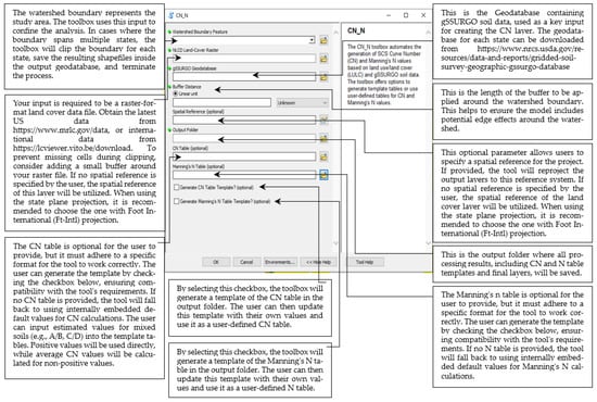 The tool offers the flexibility for users to input their own CN and n values and adjust as needed or utilize the default values in the absence of a custom table. Additionally, it provides the functionality to generate a template table for user review. As such, this tool represents a significant advancement in the simplification and automation of CN and Manning’s n calculations, ensuring a consistent and streamlined approach to this important step in setting up a hydrologic or hydraulic model. This multi-faceted functionality sets our tool apart from preceding tools, effectively bridging the divide between hydrologic modeling and geospatial analysis. The tool was developed dynamically in order to easily accommodate updates on national and global-scale projects. The following sections elaborate on how the tool works and show its application in a real-world engineering project.