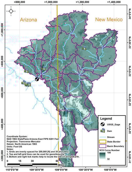 Figure 3, the CN results for the case study watershed are presented. The curve number is color-coded, with lighter shades of green representing lower CN values, indicating greater infiltration and lower runoff potentials, while darker green suggests the opposite. The sub-basin boundaries are highlighted in purple, and the state boundaries of New Mexico and Arizona are identified by a vertical, solid orange line. The map also features the USGS stream gage location and a few major dams located within this region.