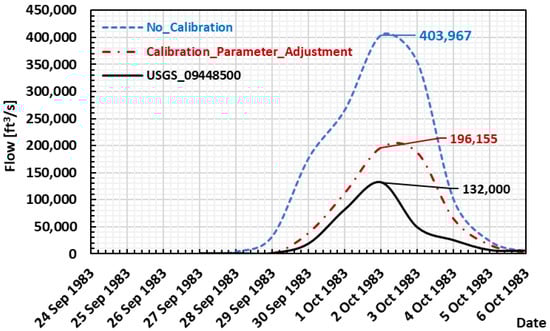 Figure 3). Applying the historical 1983 storm event (7-day, 27 September to 2 October of 1983), the model indicated a maximum daily peak discharge of 403,967 ft