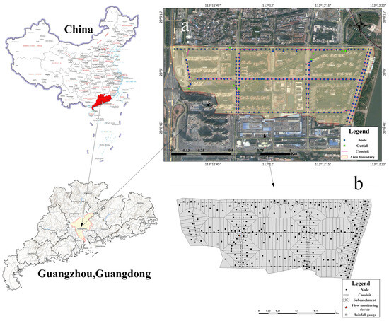Location and model structure of the study area: (a) geographical location of the study area; (b) SWMM pipe network mode.